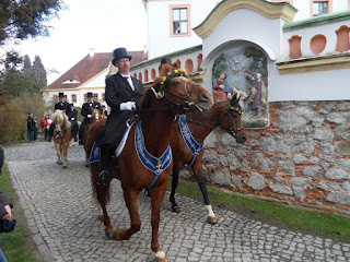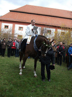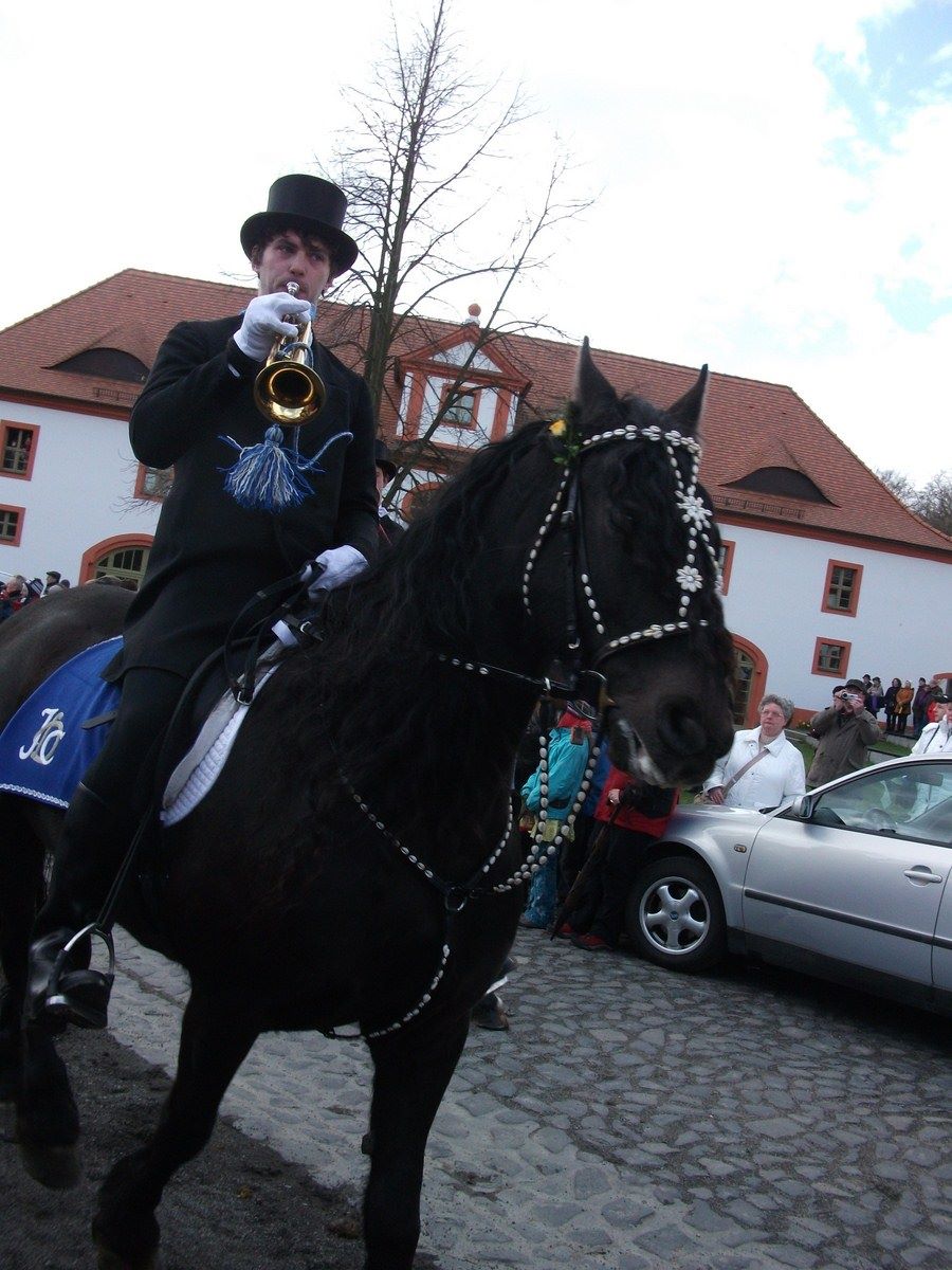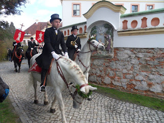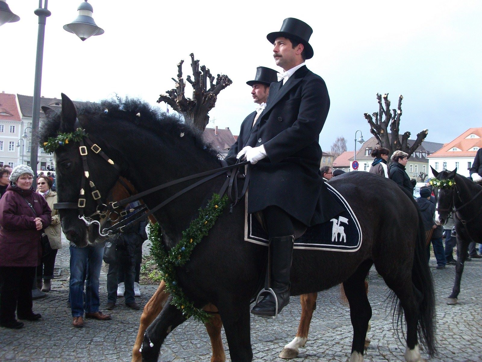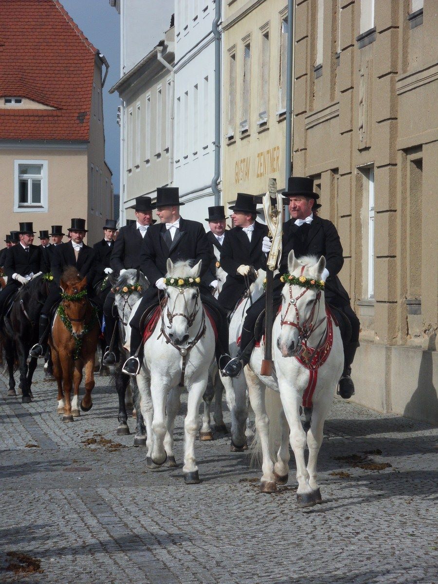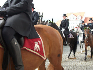I tak powoli docieramy do rynku,gdzie ku naszemu zaskoczeniu widzimy czekający tłum ludzi,zgromadzony dookoła rynku.Okazuje się,że wszyscy czekają na Procesję,która po objechaniu okolicznych wiosek i pól wraca na rynek w Ostritz,by tu okrążyć go trzykrotnie.W oddali słychać śpiew i ukazują się jeźdźcy.Pięknie to wygląda.Rozdzielamy się,ja idę na drugą stronę ulicy,staję prawie pod ratuszem i stąd robię zdjęcia.Co jakiś czas kawalkada konna zatrzymuje się,by odmówić modlitwę.Mamy okazję przyjrzeć się z bliska pięknie przybranym koniom i jeźdźcom.Zostajemy do końca i napawamy swe oczy i duszę urodą i specyfiką tego obrzędu.