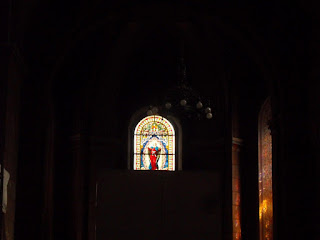Po błogosławieństwie,ze śpiewem na ustach Procesja ruszyła i jeszcze raz objechała plac klasztoru,by za chwilę opuścić klasztor i skierować się ku okolicznym wioskom,a skończyć w Ostritz.My natomiast zostaliśmy na terenie klasztoru.Mamy okazję pozaglądać wszędzie gdzie się da,więc korzystamy z okazji.Najpierw Radek staje w kolejce do sklepiku z pamiątkami,a ja z tatkiem zwiedzamy kapliczkę klasztorną.Zastanawia mnie,dlaczego w środku zbity jest tynk do gołej cegły.Wyjaśnia się to za chwilę.Zbity tynk widać prawie wszędzie,na murach okalających budynek klasztoru,w kościele,jest to pozostałość po ostatniej powodzi,która miała miejsce w sierpniu 2010r.Wszędzie jeszcze widać ogrom zniszczeń jaki poczyniła woda,ale i widać pracę przywracającą piękno tego zakątka.