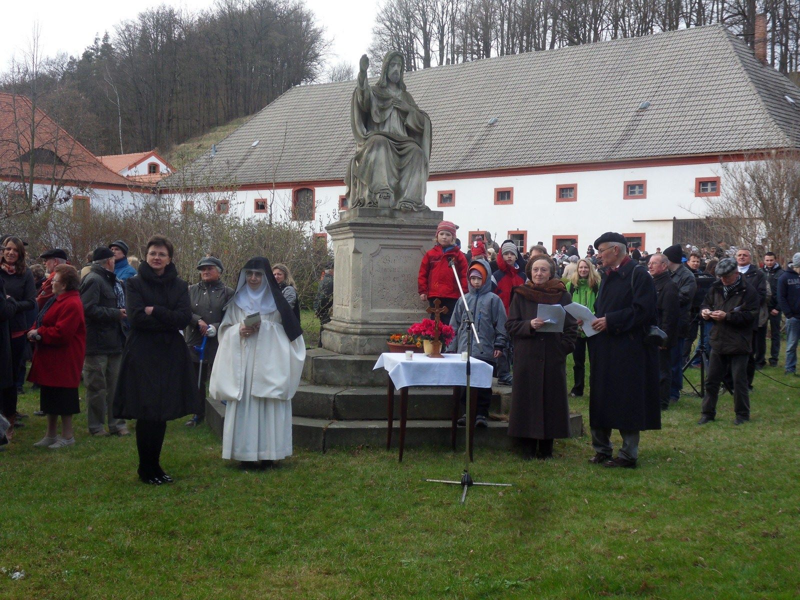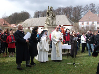 Udało nam się dogonić Procesję i za nią doszliśmy skrótem,nad Nysą do klasztoru cysterek Marienthal.Jesteśmy zaskoczeni tłumem zgromadzonym na placu przed klasztorem.Procesja kilkakrotnie okrąża plac,ze śpiewem i modlitwą,przy wtórze trąbek.W pewnym momencie,tłum obok Radka rozstąpił się i na plac obok figury Chrystusa wjechało dwóch księży katolickich.Tu odbyła się modlitwa i błogosławieństwo wszystkich przybyłych.