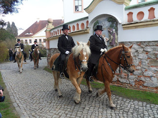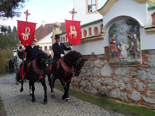 Przekraczamy granicę i ruszamy szybkim tempem w stronę rynku.Tu okazuje się,że nikogo nie ma,na bruku zostały tylko końskie kupy.Po chwili zastanowienia dochodzimy do wniosku,że nie mogą być daleko i pewnie uda nam się ich dogonić.Ruszamy po końskich śladach...hi,hi...i mieliśmy rację bo jakimś czasie w oddali ujrzeliśmy jeźdźców na koniach i ludzi czekających na procesję.