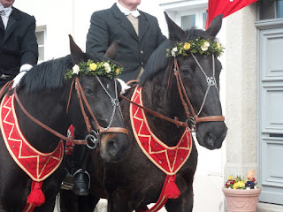 I tak powoli docieramy do rynku,gdzie ku naszemu zaskoczeniu widzimy czekający tłum ludzi,zgromadzony dookoła rynku.Okazuje się,że wszyscy czekają na Procesję,która po objechaniu okolicznych wiosek i pól wraca na rynek w Ostritz,by tu okrążyć go trzykrotnie.W oddali słychać śpiew i ukazują się jeźdźcy.Pięknie to wygląda.Rozdzielamy się,ja idę na drugą stronę ulicy,staję prawie pod ratuszem i stąd robię zdjęcia.Co jakiś czas kawalkada konna zatrzymuje się,by odmówić modlitwę.Mamy okazję przyjrzeć się z bliska pięknie przybranym koniom i jeźdźcom.Zostajemy do końca i napawamy swe oczy i duszę urodą i specyfiką tego obrzędu.
