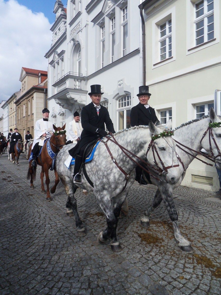 I tak powoli docieramy do rynku,gdzie ku naszemu zaskoczeniu widzimy czekający tłum ludzi,zgromadzony dookoła rynku.Okazuje się,że wszyscy czekają na Procesję,która po objechaniu okolicznych wiosek i pól wraca na rynek w Ostritz,by tu okrążyć go trzykrotnie.W oddali słychać śpiew i ukazują się jeźdźcy.Pięknie to wygląda.Rozdzielamy się,ja idę na drugą stronę ulicy,staję prawie pod ratuszem i stąd robię zdjęcia.Co jakiś czas kawalkada konna zatrzymuje się,by odmówić modlitwę.Mamy okazję przyjrzeć się z bliska pięknie przybranym koniom i jeźdźcom.Zostajemy do końca i napawamy swe oczy i duszę urodą i specyfiką tego obrzędu.