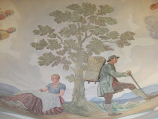 Idziemy teraz na pierwsze piętro.Tu znajduje się sala Obrad Rady Miejskiej, największe pomieszczenie w budynku. Zachowało się w niej wyposażenie pochodzące z początku XX wieku, stół dębowy, krzesła, lampy mosiężne oraz granitowa podłoga. Na stropie fasetowym w tej sali namalowano w latach 20-tych XX wieku sceny rodzajowe przedstawiające mieszkańców Kowar przy pracy i wypoczynku.Jedna ze scen była wyjątkowo niewygodna dla władz,więc pewnie dlatego zaraz po II Wojnie Światowej freski zostały starannie zamalowane.Ta scena przedstawia hołd mieszkańców Kowar składany królowi pruskiemu Fryderykowi II, który był między innymi inicjatorem I rozbioru Polski. W historii Śląska zapisał się jednak jako pomysłodawca wielu ważnych przedsięwzięć i mecenas sztuki.Autorem fresku był mało znany artysta Beuthner.