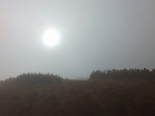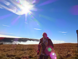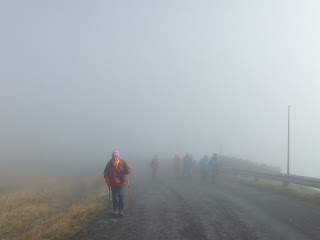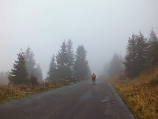 Mija mnie kilka osób z naszej grupy,ale Radka wciąż nie ma.Przystaję na chwilę,oglądam się za siebie i ledwo dostrzegam znaną mi sylwetkę.Mgła jest coraz gęstsza i bardziej wilgotna.Widoków nie ma żadnych,ale i tak jest pięknie.Zrudziałe trawy dodają koloru otaczającej nas mgle:) Radek się zastanawia czy wszyscy wyszli z hotelu i kiedy dochodzi do nas Sofijka,pyta się Jej czy jeszcze ktoś idzie za nami z naszej grupy?Sofi mówi,że nikogo już nie widziała,ale Radkowi nie daje spokoju fakt,że najprawdopodobniej z tyłu zostały Jola i Irenka.Wraca,ale nikogo już nie zauważył,więc nas dogonił i w trójkę wędrujemy w gęstej mgle :)