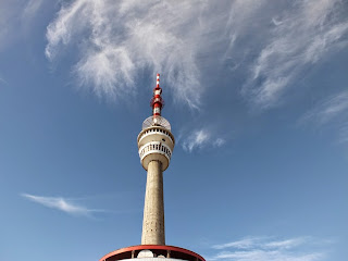 Mimo tego,że idziemy wolno to i tak doganiamy naszą grupę.Po drodze mija nas sporo turystów czeskich i polskich.Pozdrawiamy się nawzajem i nie wiedzieć kiedy stajemy na szczycie.Mgła jest tak gęsta,że nie żadnej możliwości aby dostrzec wieżę.Robimy sobie zdjęcia i dopiero po sesji zdjęciowej idziemy do budynku,w którym znajduje się restauracja i wieża telewizyjna z tarasem widokowym.Im bliżej jesteśmy budowli i spoglądamy w górę,z mgły powoli wyłania się wieża.Niezwykle to wygląda.