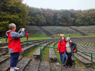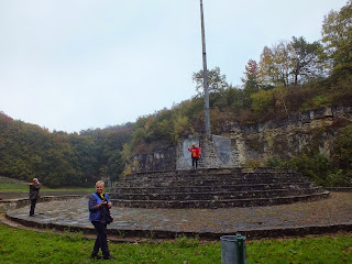 Idziemy najpierw pod Pomnik Czynu Powstańczego,który został zaprojektowany przez Xawerego Dunikowskiego.Został on postawiony w miejscu,gdzie wcześniej stało mauzoleum,w którym znajdowały się prochy poległych,niemieckich żołnierzy biorących udział w III Powstaniu Śląskim.W 1945 roku,kiedy Niemcy przegrali wojnę,mauzoleum zostało wyburzone.Uroczystego odsłonięcia pomnika dokonano dnia 19 czerwca 1955 roku.Pomnik Czynu Powstańczego składa się z czterech pylonów,które łączą się architrawem.Wewnątrz pomnika umiejscowiony jest znicz ze spiżową miednicą.Na ścianach pylonów znajdują się cztery rzeźby,które przedstawiają:górnika,rolnika,hutnika oraz Ślązaczkę z dzieckiem na ręku.Natomiast architraw przyozdobiony jest ośmioma rzeźbami ludzkich głów.Pomnik znajduje się ponad 30 metrów nad główną sceną amfiteatru,a do jego budowy zużyto ponad pięć tysięcy ton różnych materiałów budowlanych.My najpierw robimy sobie zdjęcia grupowe,a dopiero później słuchamy historii tegoż miejsca i rozchodzimy się we wszystkie strony,by na własną rękę obejrzeć to ogromne dzieło.Kiedy już wszystko zostało obejrzane i obfotografowane,powoli kierujemy się do parku,gdzie dawniej był kamieniołom.W latach trzydziestych ubiegłego wieku,gdy na te tereny były w rękach III Rzeszy,postanowiono stworzyć ogromny amfiteatr,gdzie mogłyby odbywać się wielkie wiece polityczne.Miejsce po dawnym kamieniołomie nadawało się idealnie i w 1938 roku ukończono budowę amfiteatru.W owym czasie,był on jednym z największych amfiteatrów na świecie.Mógł pomieścić od 30 do 100 tysięcy widzów,a poza tym wyróżniał się niesamowitą akustyką.W obecnym czasie,jest on jednym z największych tego typu budowli w Europie.Stajemy na chwilę i podziwiamy jego ogrom i dopiero po jakimś czasie schodzimy na scenę.Próbujemy swoich sił wokalnych,śpiewając piosenki-a co?-jak się stoi na scenie,to trza spróbować!!!