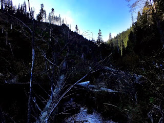 Schodząc coraz niżej,zmienia się krajobraz.Wysokie,ciemne zbocza,zamieniają się w łyse,oświetlone słońcem z kikutami po powalonych drzewach.Trzeba powiedzieć,że wywierają wrażenie.To skutek wichury,która przeszła tu w 2004 roku.Bała Opawa płynie tu spokojniej,szerszym korytem,ale to nie znaczy,że jest łatwiej.Wąska ścieżka wiedzie wzdłuż rzeczki,jest błotnista z mnóstwem przeszkód w postaci zwalonych drzew.Pokonujemy wszystkie przeszkody i powoli opuszczamy przepiękną Dolinę Białej Opawy,wchodząc do Karlovej Studánki.
