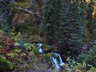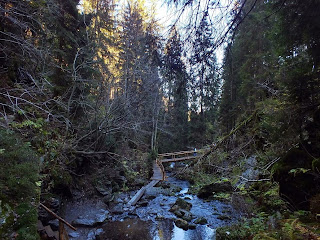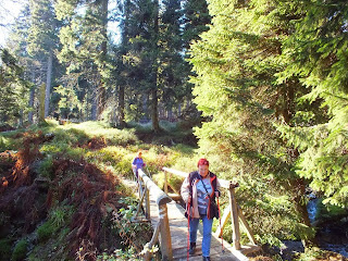 Powoli zaczynają pojawiać się drewniane kładki.Radek jest gdzieś daleko z przodu,więc kiedy Go dostrzegam stojącego przy drewnianych,drabiniastych schodach,wiem,że specjalnie czeka na mnie.Tu zmieniamy szlak i z niebieskiego schodzimy na żółty.Przed nami Vodopady Bílé Opavy.Schodzimy więc najpierw po drabiniastych schodach,później po korzeniach tworzących schody i po kamieniach.Oj zapowiada się nie lada zejście....