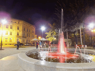 Wychodzimy z budynku i tu spotykamy Wiolę i Pawła-Oni również idą do centrum-idziemy więc razem.Postanawiamy nie przechodzić przez rzekę,tylko wędrujemy chodnikiem wzdłuż niej.Mijamy źródło "Żegnalce"-jest to najpopularniejsze źródełko w Głuchołazach.Jego nazwa ma nawiązywać do tradycji żegnania w tym miejscu osób udających się na Morawy.Woda jest niskozmineralizowana,a jej czystość poddana stałemu monitoringowi-tekst z tablicy informacyjnej.Nie próbujemy wody,bo zależy nam na czasie.Spróbujemy jej jak będziemy wracać z miasta-tak postanawiamy.Tuż za źródełkiem wchodzimy do tunelu w skale,jest to:"Grota Bialska-zwana też "Góralską"-dawna sztolnia po wydobyciu złota,ciągnąca się wzdłuż żyły kwarcowo-skaleniowej,występującej w łupkach łyszczykowych.W 1877 roku działające w Głuchołazach Towarzystwo Promenadowe przekuło drugi otwór,tworząc tunel,którym poprowadzono promenadę spacerową.Dawniej skała sięgała do samej rzeki,a chodnik omijający ją wykonano dopiero po powodzi w 1903 roku,wysadzając skałę.Sztolnia jest pomnikiem przyrody.Stanowi ona schronienie dla nietoperzy,w tym rzadkich podkowców,nocków rudych i gacków brunatnych."-tekst z tablicy informacyjnej.Przechodzimy przez tunel i do centrum miasta wciąż idziemy wzdłuż rzeki.Mijamy podświetlaną fontannę,nie zatrzymujemy się-na zdjęcia będzie czas w drodze powrotnej.Najpierw małe zakupy.Znajdujemy "Fajny" sklep,który wcale nie był fajny,a Pani,gdy go opuszczaliśmy zdegustowani-postraszyła nas,że zaraz zamknie i już niczego nie kupimy...No cóż,my się tym nie zmartwiliśmy,bo tuż nieopodal znaleźliśmy inny,otwarty sklep,gdzie zrobiliśmy spokojnie zakupy :) I powoli wracamy.Oczywiście zatrzymujemy się przy kolorowej fontannie-sesja zdjęciowa dość długa,ale inaczej być nie może :) Poza tym są tu ustawione tablice informacyjne,na których są takie teksty: