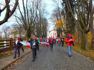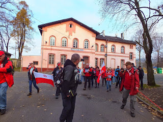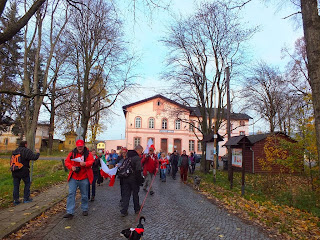Wcześniejsza pobudka pozwala nam spokojnie przygotować się do wyjazdu i kiedy jesteśmy gotowi,powoli ruszamy ku stacji kolejowej.Tu spotykamy część rajdowiczów,witamy się z Nimi,kupujemy bilety,wsiadamy do pociągu i odjeżdżamy do Janowic Wielkich.Kiedy pociąg zatrzymuje się na stacji,"wysypuje" się z niego spora grupa rajdowiczów.Następuje uroczyste powitanie przez Wiktora i omówienie dzisiejszej wędrówki.Z racji dzisiejszego Święta,większość z grupy jest przystrojona w barwy narodowe i zaopatrzona we flagi i śpiewniki pieśni patriotycznych i żołnierskich.Ze śpiewem na ustach wkraczamy w aleję jarząbu szwedzkiego :)
