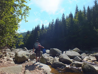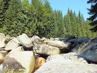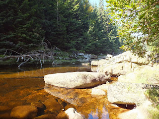 Ściągamy plecaki,w cieniu kładziemy torbę z grzybami,przebieramy się i wchodzimy do zimnej wody.Aż dreszcz przechodzi przez całe ciało.Powoli zaczynamy przyzwyczajać się do chłodu.Rozsiadamy się wygodnie na nagrzanych słońcem kamieniach,jemy kanapki,pijemy piwo i zwyczajnie lenimy się,rozkoszując się pięknem,które nas otacza :)