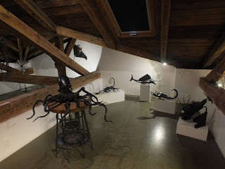 I tak wędrując ulicami Turnowa,dostrzegamy na ul.Žižkovej obdartą z tynku willę z dwiema dużymi,żelaznymi rzeźbami-co nas bardzo zaciekawiło.Wchodzimy przez otwartą bramę na podwórze-jest tu też restauracja,a przed nią duża,żółta metalowa żyrafa-robimy sobie z nią zdjęcia i idziemy do metalowych postaci.Kiedy tak je fotografujemy,w drzwiach ukazuje się Pani i woła nas byśmy weszli.Radek najpierw sprawdza która jest godzina i stwierdza,że mamy na tyle czasu,by zajrzeć do środka.Wchodzimy więc i zaczynamy oglądać prace uczniów szkoły BBart Turnov, ale także różne dzieła sztuki rzemieślników i producentów z Czeskiego Raju.Przechadzamy się od jednej do drugiej sali,oglądamy niesamowite rzeźby,robimy zdjęcia-całe mnóstwo zdjęć,a kiedy już wszystko obejrzymy,powoli wychodzimy na zewnątrz.Jesteśmy zachwyceni tym co widzieliśmy i żałujemy,że nie mamy więcej czasu...