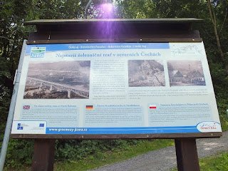 Kiedy docieramy do miejscowości Rakousy,trochę się gubimy i idziemy prosto,ale po jakimś czasie gdy nie dostrzegamy oznaczenia ścieżki rowerowej,wracamy do wiaduktu.Przed samym mostem,odnajdujemy oznaczenie rowerówki.Skręcamy więc na wąską dróżkę i pniemy się nią do góry na wiadukt.Ścieżka rowerowa jest tu poprowadzona wzdłuż torów.Oddzielona jest od nich metalowym płotem z siatki.Idziemy nią,robimy zdjęcia,przyglądmy się płynącym w dole kajakom i powoli schodzimy z mostu.