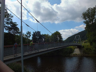Mijamy co jakiś czas niewielkie knajpki,w których panuje spory ruch.Rowery zaparkowane obok świadczą o tym.Znów wkraczamy na most nad Izerą.Jest wiszący i malowniczy i gdy się po nim idzie,to się lekko buja.Krótka sesja zdjęciowa i ruszamy dalej.