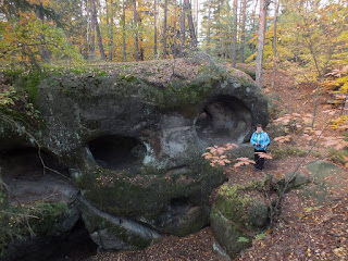 Kiedy stajemy na dole między głazami,jesteśmy zaskoczeni widokiem jaki się nam ukazał.Ogromne dziury w skałach tworzą nietypowe mini jaskinie,pieczary,okna i przejścia.Ryty w piaskowcu świadczą o tym że ludzie to miejsce wykorzystywali od dawna jako schronienie i odwiedzali je często..Zaglądamy wszędzie,robimy zdjęcia i dziwimy się naszym współwędrowcom że tu nie schodzą,tylko patrzą na nas z góry a potem idą dalej.My mamy tu bardzo długą sesję zdjęciową i dopiero po niej podążamy dalej.