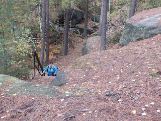 Ścieżka usłana rudymi liśćmi i igłami,wije się między drzewami i skalnymi basztami.Z każdym krokiem skał ukazuje się nam więcej.Mają dziwne kształty i dziury,przez co wyglądają niesamowicie malowniczo.Mija nas coraz więcej ludzi-Oni idą w przeciwną stronę niż my.Pozdrawiamy się nawzajem i wędrujemy dalej.Znów zaczynamy się piąć w górę,co jakiś czas wchodzimy po schodach i w końcu docieramy do pierwszego naszego dzisiejszego celu.