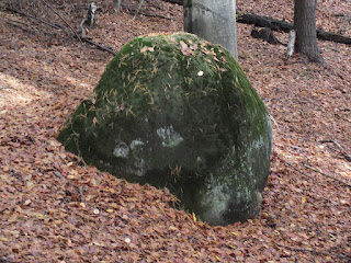 Wędrujemy wąską ścieżką,wijącą się między drzewami i docieramy punktu widokowego,gdzie zatrzymujemy się na kilka zdjęć,a po nich idziemy rudą od liści dróżką dalej.Doprowadza nas ona do wąziutkiej,wydeptanej wśród jagodziwia ścieżynki wiodącej ciut w dół,ku skalnej bramie-tak wygląda z góry.Oczywiście nasza ciekawość bierze górę i schodzimy do skalnej bramy.