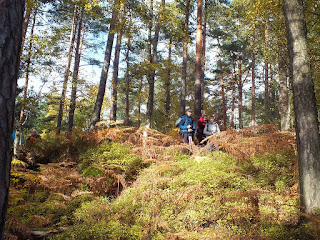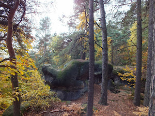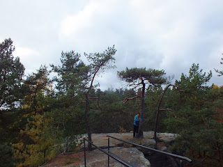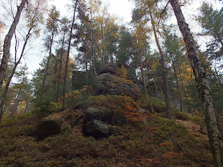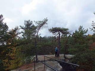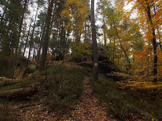 Ścieżka usłana rudymi liśćmi i igłami,wije się między drzewami i skalnymi basztami.Z każdym krokiem skał ukazuje się nam więcej.Mają dziwne kształty i dziury,przez co wyglądają niesamowicie malowniczo.Mija nas coraz więcej ludzi-Oni idą w przeciwną stronę niż my.Pozdrawiamy się nawzajem i wędrujemy dalej.Znów zaczynamy się piąć w górę,co jakiś czas wchodzimy po schodach i w końcu docieramy do pierwszego naszego dzisiejszego celu.