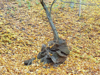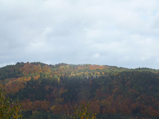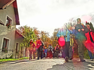 Szlak wiedzie nas teraz w dół.Wędrujemy po szeleszczącym,rudym od liści dywanie.Niezwykle malowniczo wygląda nasza droga.Pani Jesień ma tu piękną sukienkę :)