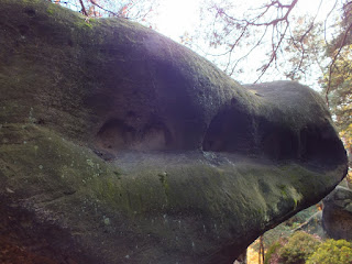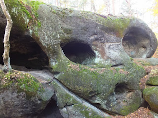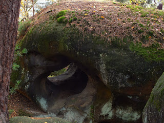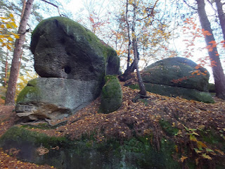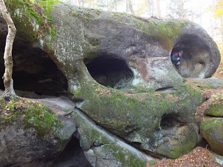 Kiedy stajemy na dole między głazami,jesteśmy zaskoczeni widokiem jaki się nam ukazał.Ogromne dziury w skałach tworzą nietypowe mini jaskinie,pieczary,okna i przejścia.Ryty w piaskowcu świadczą o tym że ludzie to miejsce wykorzystywali od dawna jako schronienie i odwiedzali je często..Zaglądamy wszędzie,robimy zdjęcia i dziwimy się naszym współwędrowcom że tu nie schodzą,tylko patrzą na nas z góry a potem idą dalej.My mamy tu bardzo długą sesję zdjęciową i dopiero po niej podążamy dalej.