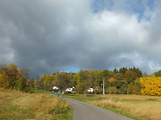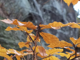 Kiedy tak sobie niespiesznie idziemy,nasz szlak nagle skręca w prawo w polną dróżkę.Oczywiście przegapiamy go i dopiero po jakimś czasie to dostrzegamy.Wracamy więc kawałek,odnajdujemy ową dróżkę i nią pniemy się w kierunku rudo-złotego lasu.Liście drzew są cudnie wybarwione i kuszą swymi kolorami by stanąć,podziwiać i robić zdjęcia.Oczywiście czynimy tak,ale i wędrujemy dalej.Kiedy wchodzimy do lasu jest jeszcze piękniej.Drzewa ubrane są w złoto-rude liście,a droga usłąna jest szeleszczącym pod nogami dywanem w różnych odcieniach rudości.Niesamowicie malowniczy to widok :) Chłoniemy to piękno i powoli idziemy dalej.