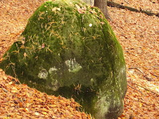Wędrujemy wąską ścieżką,wijącą się między drzewami i docieramy punktu widokowego,gdzie zatrzymujemy się na kilka zdjęć,a po nich idziemy rudą od liści dróżką dalej.Doprowadza nas ona do wąziutkiej,wydeptanej wśród jagodziwia ścieżynki wiodącej ciut w dół,ku skalnej bramie-tak wygląda z góry.Oczywiście nasza ciekawość bierze górę i schodzimy do skalnej bramy.