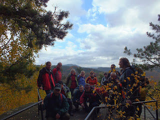 Po dość długiej sesji zdjęciowej na szczycie skał-widoków stąd nie ma,bo wysokie drzewa je zasłaniają-schodzimy na polankę między skałami.Tu czekamy na resztę grupy i robimy niekompletne zdjęcia grupowe,a po nich powoli wędrujemy dalej.