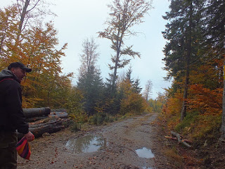 Ruszamy więc na szlak.Idziemy zielonym,rozglądamy się za grzybami,podziwiamy pięknie wybarwione drzewa,rozmawiamy,robimy zdjęcia i cieszymy się swoim towarzystwem :) Droga mija nam szybko i nie wiedzieć kiedy docieramy do krzyżówki szlaków.Skręcamy w lewo i wędrujemy szeroką,wygodną,szutrową drogą.Miejscami jest ciutkę rozjechana,ale to nie dziwi,bo w lesie trwają prace leśne,wycinka drzew i zrywka drewna.