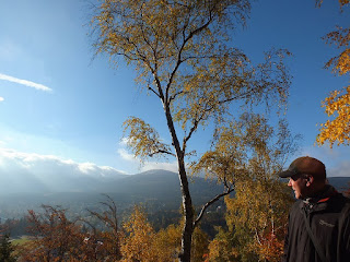 Przy moście nad Izerą krótka sesja zdjęciowa,a po niej przechodzimy na drugi brzeg.Tędy wiedzie "Cyklostezka Járy Cimrmana aneb na kole okolo Liptákova".Zaczyna się przy schronisku Orle-tak wskazuje mapa.Tu na granicy polsko-czeskiej Jára Cimrman zostawił swe ślady stóp i Radek koniecznie chce je odnaleźć.Niestety,mimo poszukiwań nigdzie ich nie możemy namierzyć.Robimy więc kilka zdjęć,chwilkę odpoczywamy i ruszamy w drogę powrotną.Mamy jesień,a co za tym idzie dni są coraz krótsze,więc szybko robi się ciemno,a my nie chcemy wracać po ciemaku.Mijamy Granicznik,wychodzimy z lasu,przystajemy na chwilkę by nasycić oczy pięknym widokiem i schodzimy do Schroniska Orle.Wchodzimy do środka,podbijamy nasze kajety,niczego nie zamawiamy-mamy sporo jedzenia w plecaku.Wychodzimy więc na zewnątrz,rozsiadamy się pod dachem,wyjmujemy kanapki i zaczynamy się posilać.