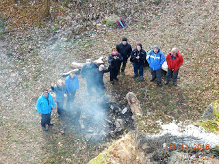 Oczywiście wszyscy już są na miejscu i smażą kiełbasy nad płonącym ogniskiem.Ściągamy plecaki,wyjmujemy jedzenie i zaczynamy biesiadowanie.Zapach smażonych kiełbasek unosi się ku górze,kusząc innych,bo co jakiś czas docierają tu kolejni spacerowicze.My posilamy się,rozmawiamy,śmiejemy,robimy zdjęcia,a czas powolutko sobie płynie.Przy ognisku jest ciepło,ale już ciut dalej,ciągnie mroźnym chłodem,więc i co niektórzy zaczynają powoli się zbierać w drogę do Górzyńca.Zanim ruszą,robimy sobie jeszcze grupowe zdjęcie,a po nim żegna się z nami kilka osób.