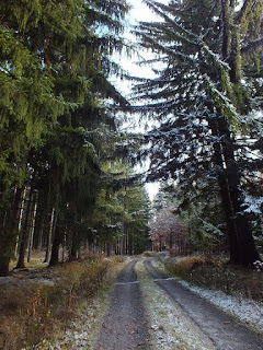 Kiedy tak idziemy,droga wkracza do lasu.Jesteśmy też coraz wyżej,bo dookoła nas krajobraz jest przypruszony niewielkim śniegiem i mrozem,a poza tym czuć chłód w powietrzu.Gdy jesteśmy niedaleko skrzyżowania wielu dróg leśnych,dzwoni Pawła telefon.To Jarek,który pyta gdzie jesteśmy i mówi Pawłowi jak mamy iść dalej.Zatrzymujemy się na chwilkę na Polanie Czarownic.Robimy kilka zdjęć i ruszamy,skręcając w drogę oznaczoną niebieskim szlakiem.Wędrowanie umilamy sobie rozmowami i robieniem zdjęć.Las wygląda bajkowo.Rudości mieszają się z bielą i zielenią.Jesień z zimą toczy walkę....