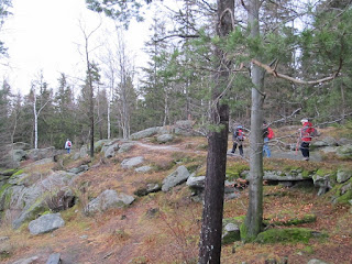 Niespiesznie,wędrujemy leśną ścieżką i docieramy do punktu widokowego "Złoty Widok".Tu również znajdują się kociołki wietrzeniowe.W jednym z nich,zawsze gdy tu jestem jest woda.I dziś też jest.Stajemy przy nim,mieszamy wielkim drągiem w kociołku,pozując przy okazji do zdjęć.Po sesji,stajemy na wielkich głazach i spoglądamy na Karkonosze.Niestety mgła i chmury szczelnie je zasłoniły,więc "złotego widoku" dziś nie mamy,ale cieszymy się tym co widzimy.Po nasyceniu oczu i aparatów,idziemy dalej.