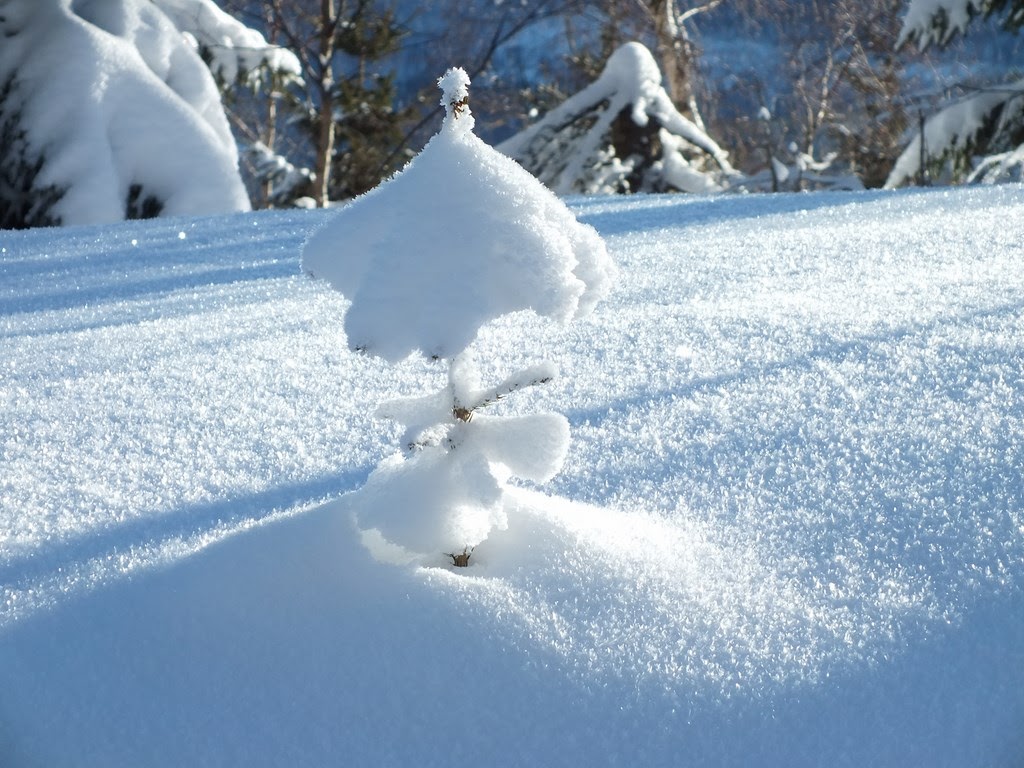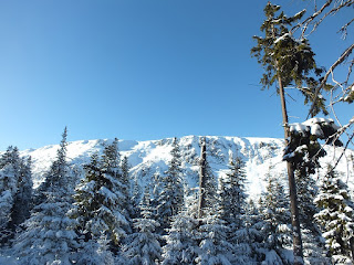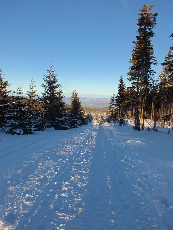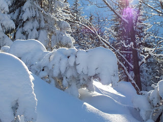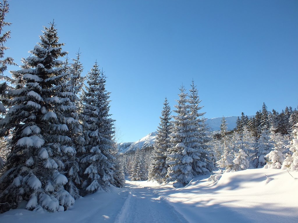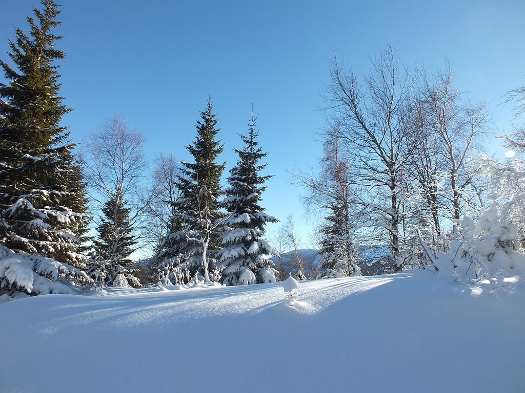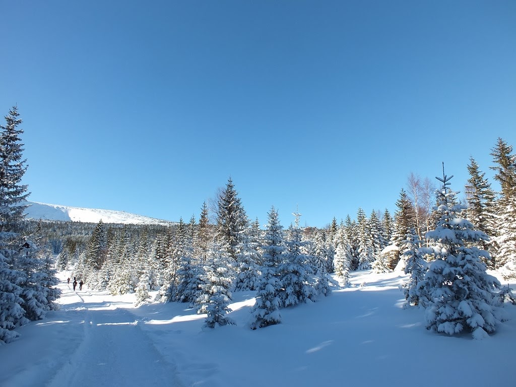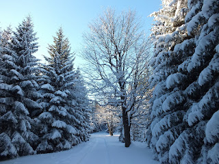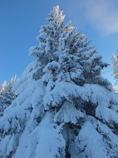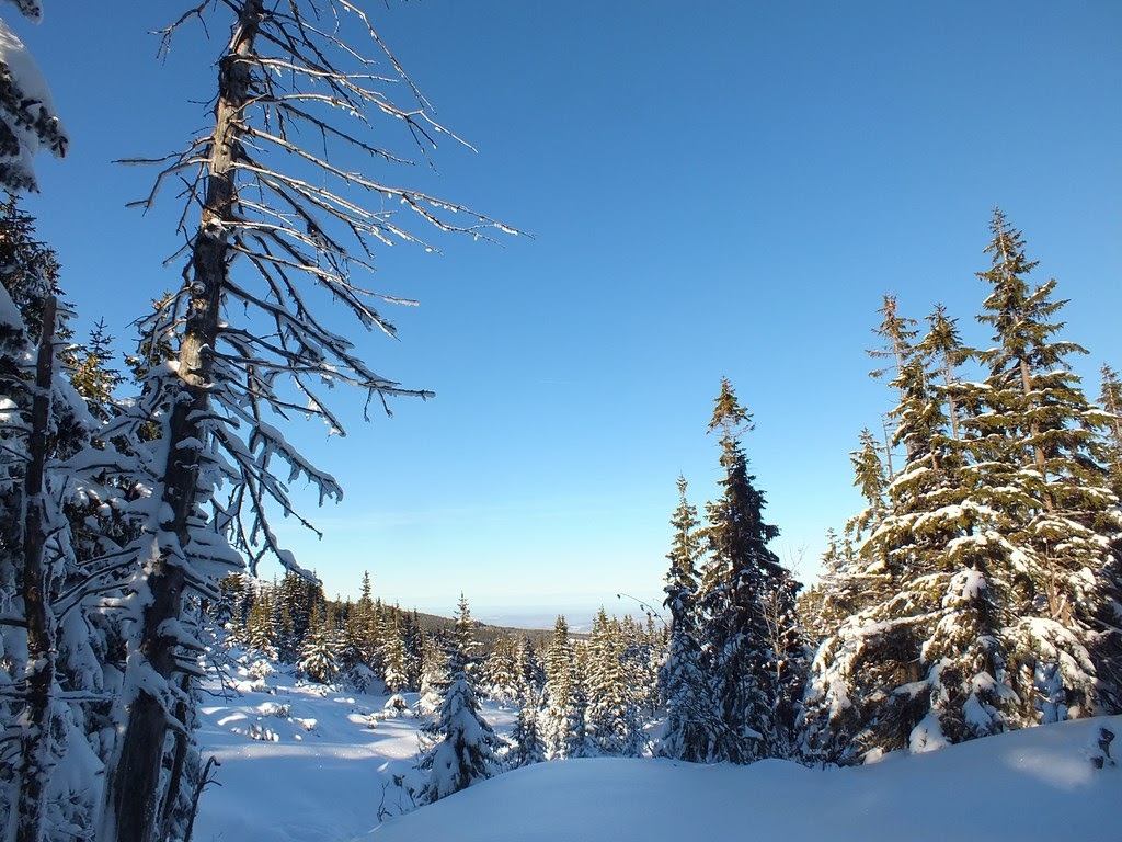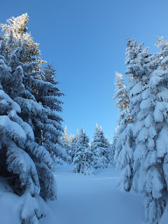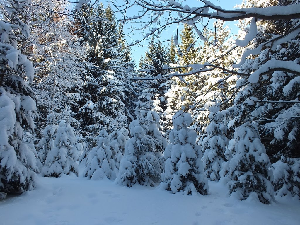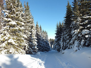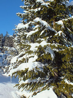 Kiedy "Samotni" już nie widzimy,postanawiamy iść ciut szybciej.Jednak po kilku krokach zatrzymujemy się na dość dłuższy czas.To co mamy dookoła,wprawia nas w euforię.Prawdziwa kraina Królowej Zimy.Bajkowo oblepione choinki,równiutko rozsypany śnieg,mieniący się "diamentami" i "kryształami" w słońcu.Bajka :)