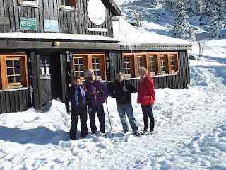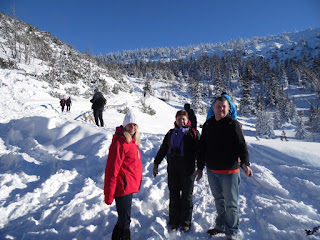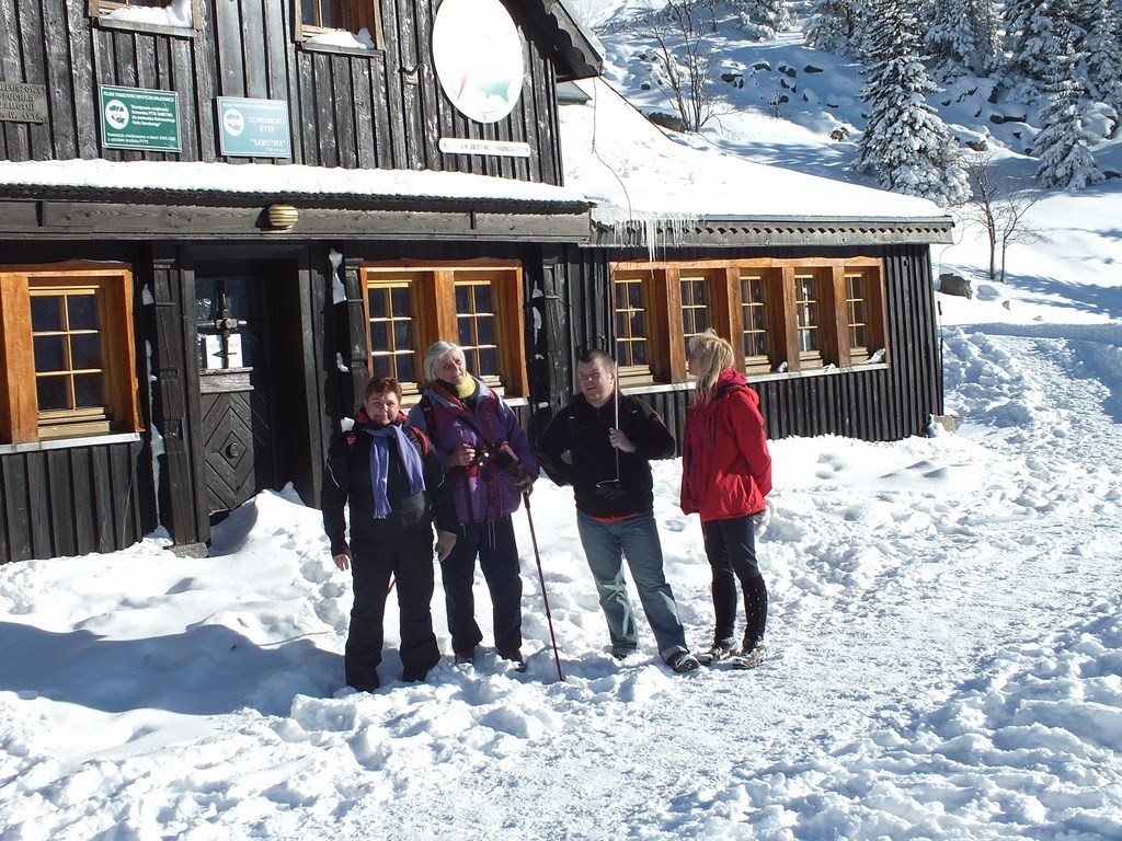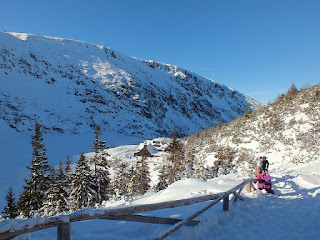 Kiedy jesteśmy już niedaleko Schroniska "Samotnia",spotykamy Violę z Pawłem.Witamy się serdecznie i radośnie.Robimy sobie zdjęcia i razem już wędrujemy.Przystajemy przy Małym Stawie-jest zamarznięty i biały od śniegu,kilka wspólnych zdjęć i wchodzimy do Schroniska.