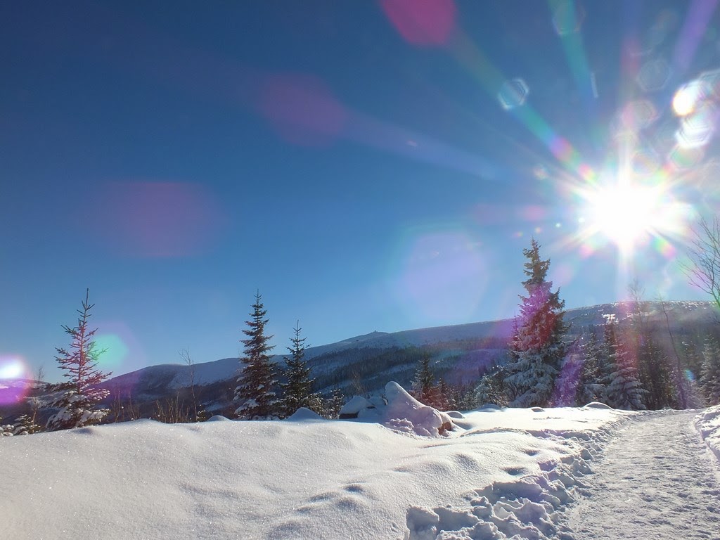 I tak bez pośpiechu docieramy na Polanę.Tu postanawiamy chwilę odpocząć i napić się gorącej herbaty.Sofijka rozsiada się wygodnie na ławce,wystawia twarz do słońca,a ja piszę smsa do Radka,a po nim dzwonię do Henia i składam Mu życzenia imieninowe.Przy okazji opowiadam Mu jak tu jest dziś cudnie.Polana skrzy się w słońcu "kryształkami" i "diamencikami".Stwierdzam z Sofijką,że Karkonosz jest dziś w wyśmienitym humorze,bo porozrzucał dookoła tyle piękności :)