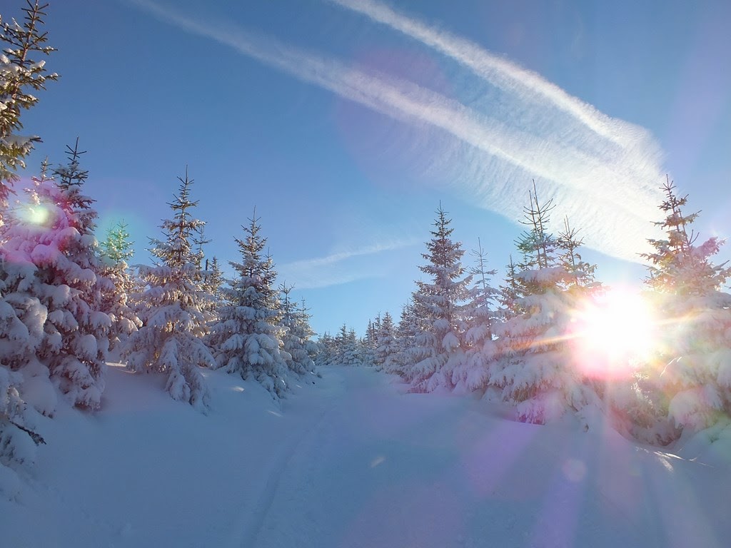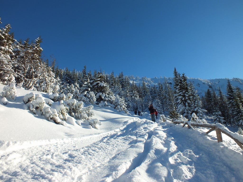Kiedy "Samotni" już nie widzimy,postanawiamy iść ciut szybciej.Jednak po kilku krokach zatrzymujemy się na dość dłuższy czas.To co mamy dookoła,wprawia nas w euforię.Prawdziwa kraina Królowej Zimy.Bajkowo oblepione choinki,równiutko rozsypany śnieg,mieniący się "diamentami" i "kryształami" w słońcu.Bajka :)