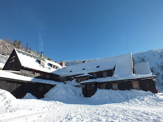 Kiedy jesteśmy już niedaleko Schroniska "Samotnia",spotykamy Violę z Pawłem.Witamy się serdecznie i radośnie.Robimy sobie zdjęcia i razem już wędrujemy.Przystajemy przy Małym Stawie-jest zamarznięty i biały od śniegu,kilka wspólnych zdjęć i wchodzimy do Schroniska.