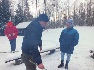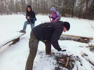 Panowie rozpalają ognisko,co niestety nie jest dziś łatwym zadaniem,bo gałęzie są wilgotne.Mimo to po kilku próbach ognisko zaczyna płonąć,kusząc by przy nim stanąć,ogrzać się i smażyć kiełbaski.Zaczynamy więc biesiadę :)