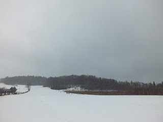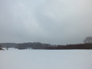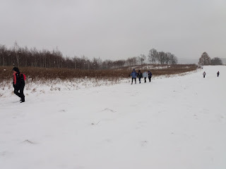 Kiedy docieramy do białych od śniegu pól,Marlenka i Sofijka ściągają plecaki,kładą się w śniegu i robią "orzełki",bawiąc się przy tym niesamowicie.Po "orzełkowej" sesji zdjęciowej,wędrujemy skrajem pola dalej,zmierzjąc ku drodze między drzewami.