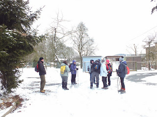 Kiedy docieramy do białych od śniegu pól,Marlenka i Sofijka ściągają plecaki,kładą się w śniegu i robią "orzełki",bawiąc się przy tym niesamowicie.Po "orzełkowej" sesji zdjęciowej,wędrujemy skrajem pola dalej,zmierzjąc ku drodze między drzewami.
