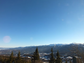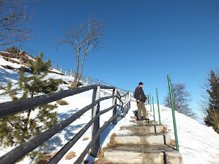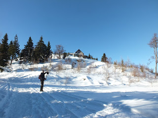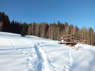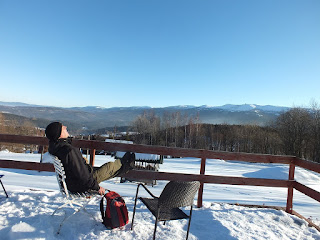 Odśnieżona droga doprowadza nas na teren Ośrodka Domków Rekreacyjnych.Tu skręcamy w lewo i wąską,wydeptaną ścieżeczką pniemy się ciut w górę,ku niewielkiemu,drewnianemu tarasowi z krzesłami.Rozsiadamy się i spoglądamy na Karkonosze górujące w oddali.Faktycznie "Złoty Widok",a przede wszystkim bardzo ciekawy pomysł.Po nasyceniu oczu i aparatów,zaczynamy powoli wracać,kierując się ku stacji kolejowej w Szklarskiej Porębie Górnej.