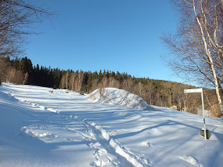 Wedrujemy przez las,wąską,wydeptaną w śniegu ścieżką.Wyprowadza nas ona na niewielkie osiedle.Przechodzimy obok nowych budynków mieszkalnych i wchodzimy na drogę między polami.