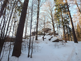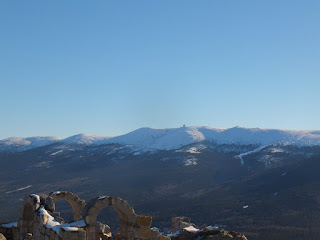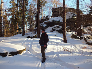 Zatrzymujemy się przy skałach u podnóża Wysokiego Kamienia.Wchodzimy na nie i podziwiamy cudowną panoramę Karkonoszy.Kilka zdjęć i ruszamy w drogę powrotną.Idziemy tak samo jak przyszliśmy.Śnieg jest idealny do chodzenia,więc droga powrotna mija nam niesamowicie szybko.Zatrzymujemy się przy oznaczeniu Punkt widokowy,150 m,"Trzy Kultury-Złoty Widok".Spoglądamy na siebie i oboje stwierdzamy,że trzeba to sprawdzić.Idziemy więc w tamtym kierunku.