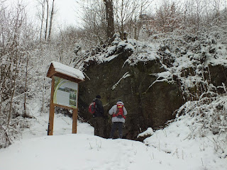 Zatrzymujemy się tylko na chwilkę przy schronisku Perła Zachodu,robiąc kilka zdjęć.Jesteśmy najedzeni,więc postanawiamy iść dalej.Śnieg cały czas sypie i kusi do lepienia śnieżek.Każde z nas zaczyna więc ugniatać w dłoniach śniegowe kulki i rzucać nimi.Bawimy się jak dzieci.W pewnym miejscu,Radek pyta się nas czy byłyśmy przy źródełku,ale nie tym niedaleko wiadutku,tylko tym drugim? Oczywiście,ani ja,ani Ela nie byłyśmy.więc stwierdzamy,że Radek musi nas tam zaprowadzić."Nie masz wyjścia"-mówię Radkowi.Idziemy więc w kierunku oznaczonego tabliczką,alternatywnego przejścia do ścieżki rowerowej w kierunku Jeleniej Góry.To właśnie na tej alternatywnej trasie znajduje się owe źródełko.Wędrujemy w nieudeptanym sniegu,pnąc się wyżej i wyżej.Z prawej strony u góry dostrzegamy punkt widokowy Trafalgar,a z lewej strony,patrząc w dół rzekę Bóbr i ścieżką rowerowo-pieszą.Idziemy tak jakiś czas,aż docieramy do skały z której wypływa woda.To właśnie jest "Źródło Hipokrene".
