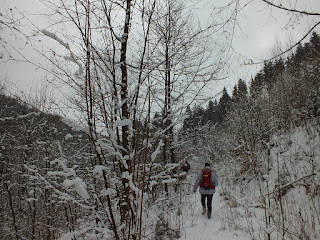 Po odsapnięciu i małym co nieco,postanawiamy iść dalej,ale nie wracamy tą samą drogą,a przedzieramy się przez zaśnieżone krzaki.Wędrujemy ledwo widoczną ścieżką.Śnieg sypie się z gałązek na głowy i za kołnierze,a my przedzieramy się przez zaspy,śmiejąc się z naszego wyboru drogi powrotnej.