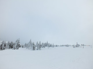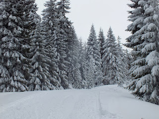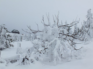 Powoli idziemy ku naszemu celowi.Oglądamy się za siebie,podziwiamy panoramę Gór Izerskich,robimy zdjęcia i wędrujemy dalej,mając przed sobą śnieżną krainę,z oblepionymi do połowy białym,wilgotnym,ciężkim śniegiem choinkami.Dziwnie to wygląda,ale i pięknie.Zima jest niepowtarzalna :)