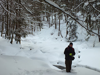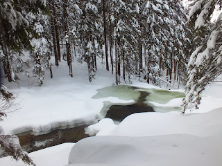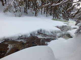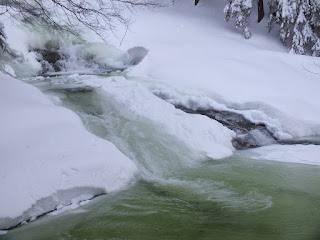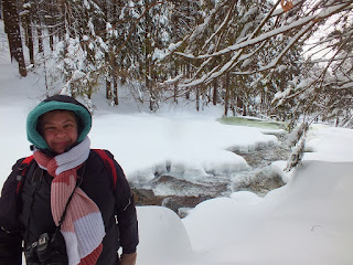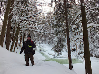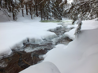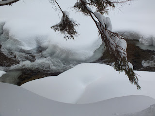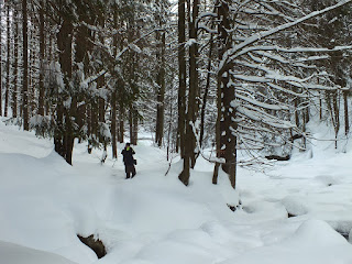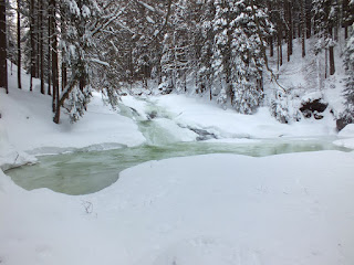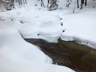Im jesteśmy wyżej,tym brnięcie w głębokim śniegu jest trudniejsze,ale nie poddajemy się,idziemy dzielnie po kolana w białym puchu.Rzeka tu nie jest cała zamarznięta,wąska strużka płynie wartko między oblodzonymi i zasypanymi kamieniami.Niezwykle to wygląda.Patrzymy jak zauroczeni tym widokiem.Robimy zdjęcia,podziwiamy piękno,radując się nim i ciesząc się swoim towarzystwem :)
