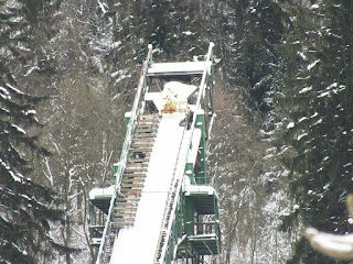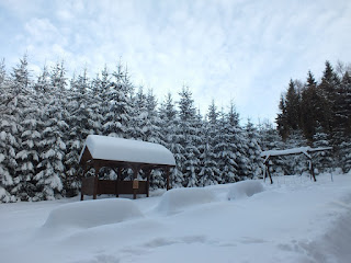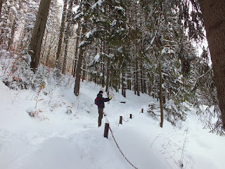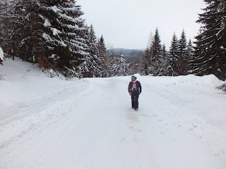 Idziemy więc krętą,pnącą się ku górze szosą z białym,ubitym śniegiem,który skrzypi przy każdym kroku.Nie ma wiatru,więc duży mróz nie jest tak mocno odczuwalny.Krajobraz,który nas otacza jest piękny,w kolorach biało-czarnych,ze wszystkimi odcieniami szarości,sprawia wrażenie starych fotografii.Jest bajkowo i przecudnie.