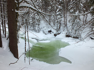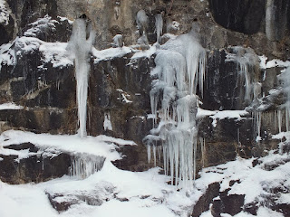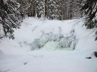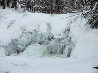 Najpierw stajemy na mostku,na wprost wodospadu,a właściwie lodospadu,bo praktycznie cały jest zamarznięty i tylko gdzieniegdzie niewielkimi strużkami płynie woda,poza tym całość jest zasypana śniegiem,przez co traci trochę uroku.Nic to! Robimy zdjęcia,można by rzec,że całe mnóstwo zdjęć robimy,a dopiero po nich idziemy zobaczyć "szklane drzewo".