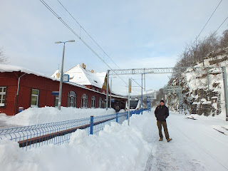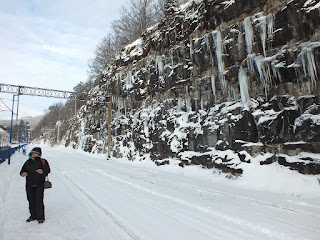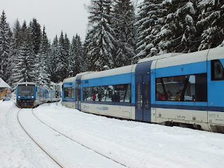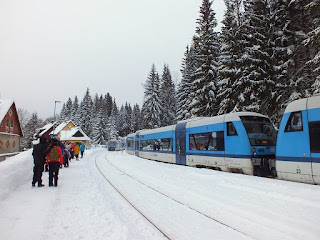 Podróż mija nam szybko i bezproblemowo.W Szklarskiej Porębie Górnej pociąg wjeżdża na peron I,co dla nas jest zaskoczeniem,no ale nowy rok przynosi jakieś zmiany,widać na dobre.Przechodzimy na II peron-omyłkowo,bo czeski pociąg odjeżdża z III,ale wykorzystujemy naszą pomyłkę na zrobienie sopelkowych zdjęć.Skalna ściana zimą wygląda rewelacyjnie.Po sesji zdjęciowej przechodzimy na pero III,gdzie właśnie wjechał czeski pociąg,wsiadamy do niego,rozsiadamy się wygodnie i jedziemy.